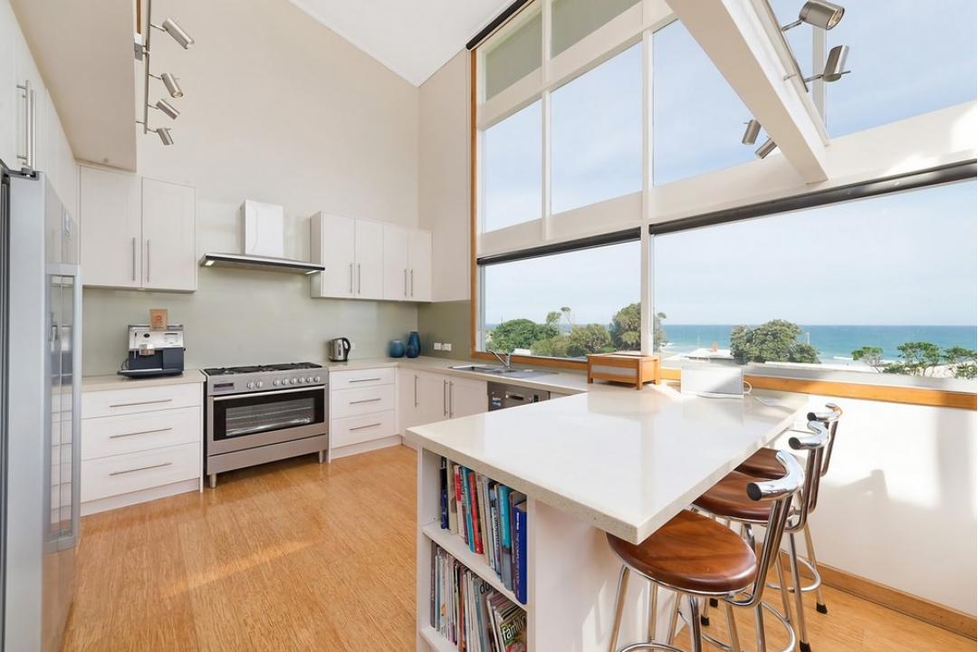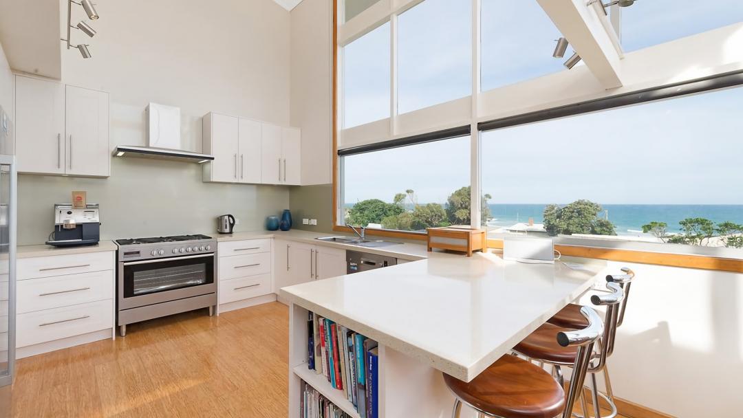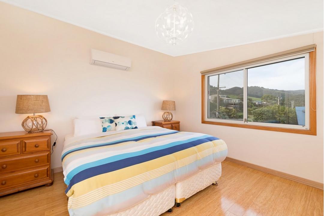 The enormous deck boasts views of Skenes Creek beach, a glass balcony, and outdoor seating for ten. The north-facing part of the deck is a sunny haven where you can watch the waves and be joined by local birds, including fairy wrens, willie wagtails, and occasionally a magnificent king parrot.